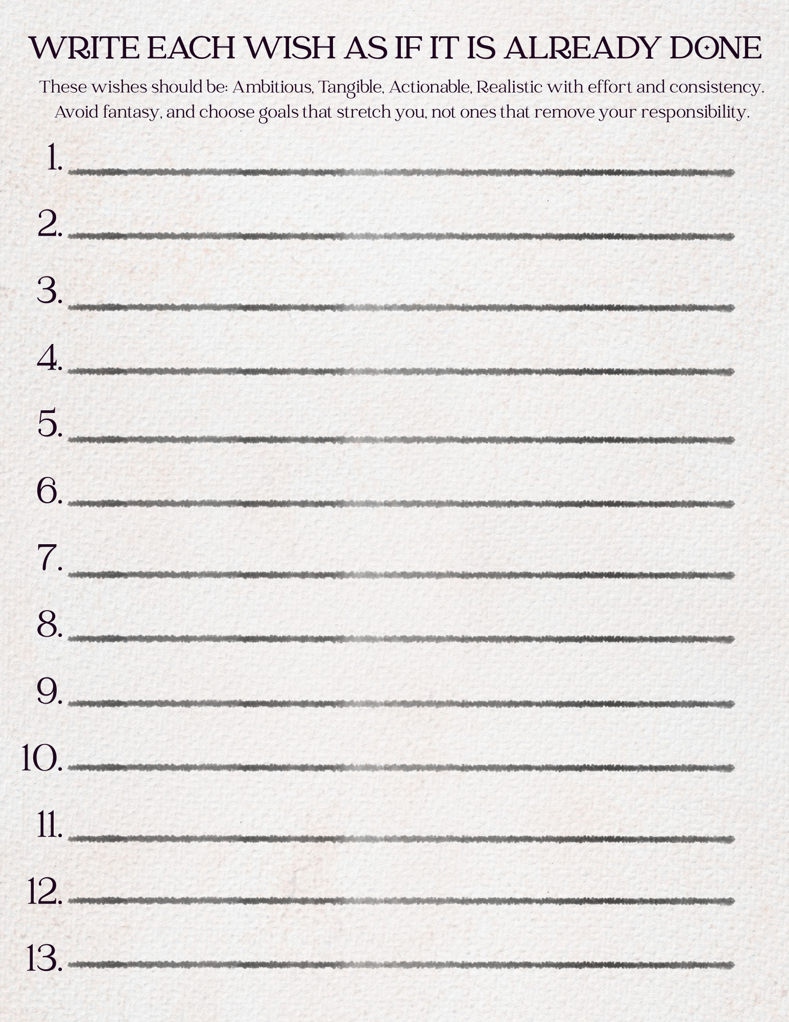 Each “wish” is meant to be tangible, actionable, and written in present terms. Not as a hope, but as a declaration of direction. Twelve wishes are released to divine timing. The thirteenth is kept as a personal commitment... the one you take responsibility for building through discipline, consistency, and follow-through.